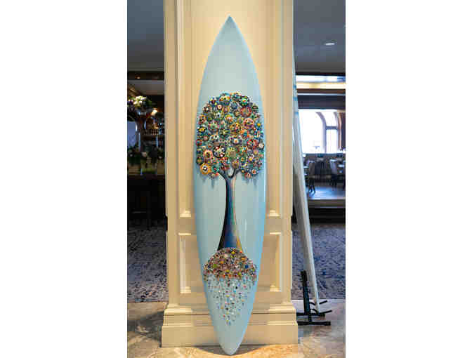 This original Tree of Love has been painted, sculpted and assembled on an 8’ Brawner Surfboard. Each circle in the tree was individually sculpted, textured, hand painted, and adorned with found objects including gemstones, crystals, vintage keys, beads, hex nuts, etc. The surfboard was coated in a 2-part epoxy resin which permanently embeds each object and creates an irresistible glassy appearance.
