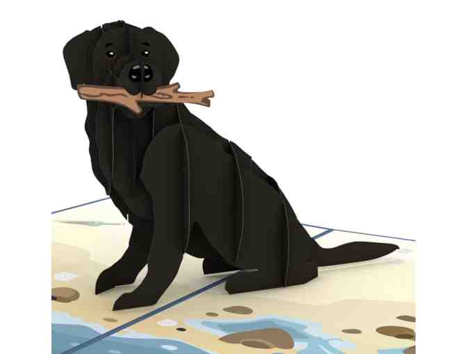 The deep blue cover of the Black Lab pop-up card features a laser-cut dog with a cheery red collar and a big smile, thrilled to be at the beach.
