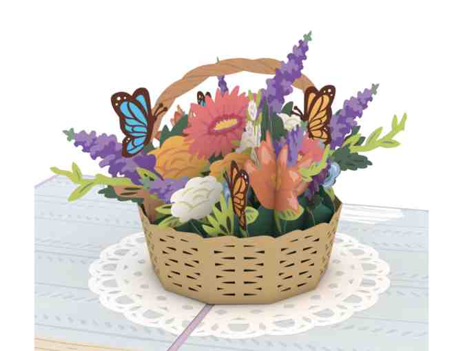 The front of this pale purple cover features a laser cut arrangement of colorful, blooming flowers, accompanied by blue and orange butterflies. Upon opening this beautiful card, a basket appears full of luscious vibrant flowers and greenery. The wicker basket sits on top of a white doily, used to decorate the pale blue tabletop. A few butterfly friends rest on top of the floral arrangement, taking a quick pause before fluttering away.