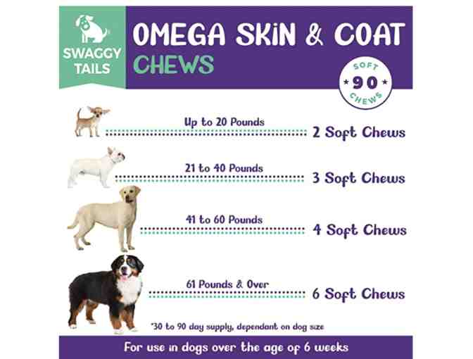 You will receive a container of 90 Swaggy Tails Omega Skin and Coat Chews and your pet is sure to love these delicious supplements.