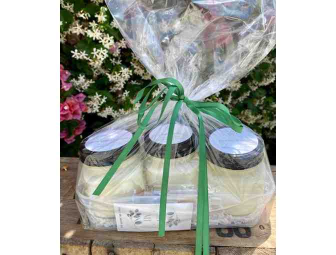 From local seller, Mimi's Handcrafted Goods, a self care gift basket with a trio of all-natural soy candles including a small glass container of matches.