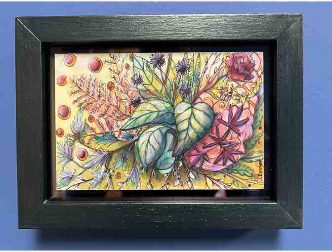 Flower Explosion - mixed media on watercolor paper artwork in handpainted frame by Jo Ann Berger, Wyoming artist. 5 x 7" artwork in 6 x 8" frame.