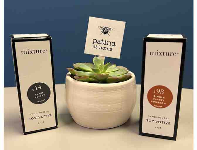 Small succulent in white ceramic pot and 2 mixture brand soy candles in black pepper and single barrel bourbon scent.