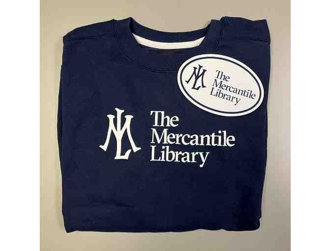 One household membership to The Mercantile Library. Includes navy blue Mercantile Library sweatshirt (size M) and logo magnet.