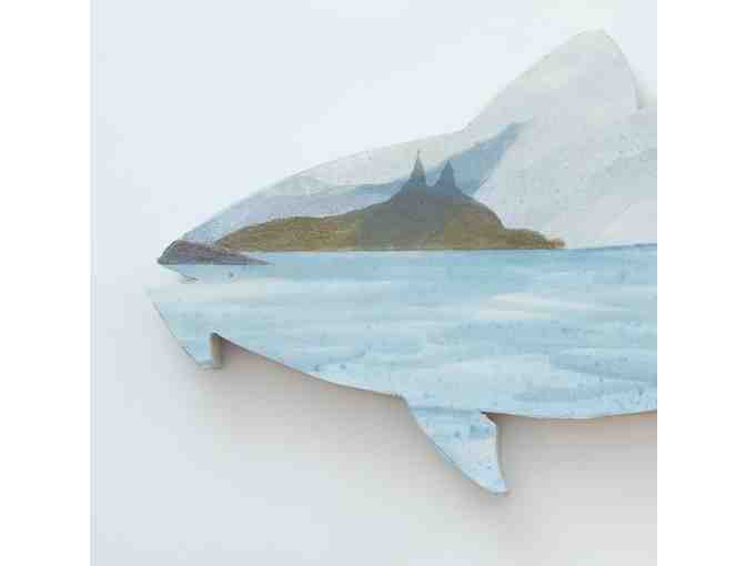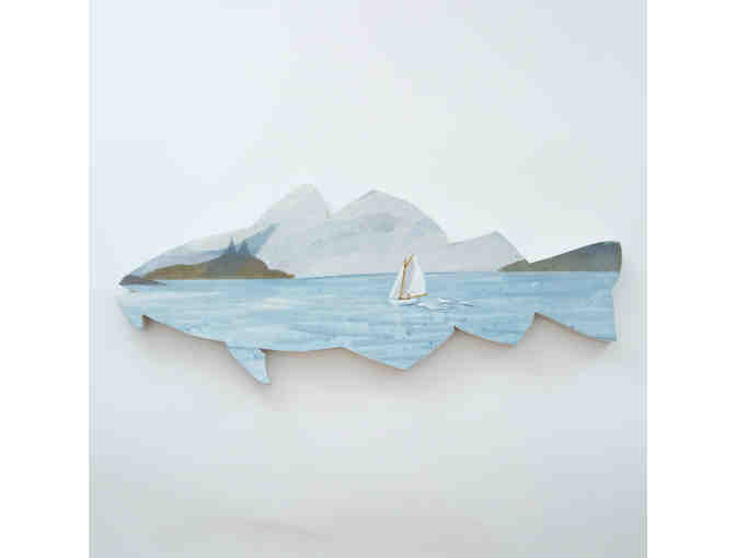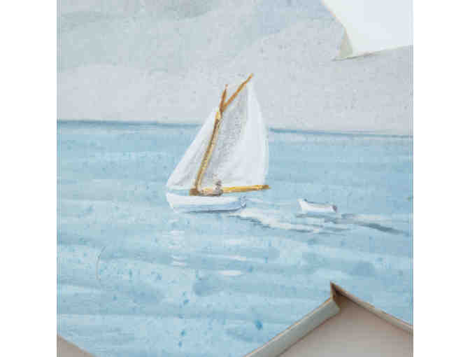 A lone sailboat heads out of the harbor to the cruising grounds downeast. The image has been varnished for wiping and dusting with a damp cloth, for inside use only. Signed by the artist on back.