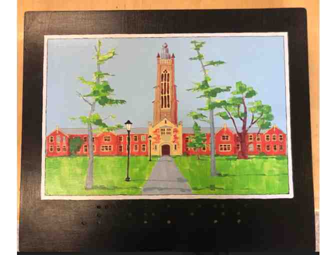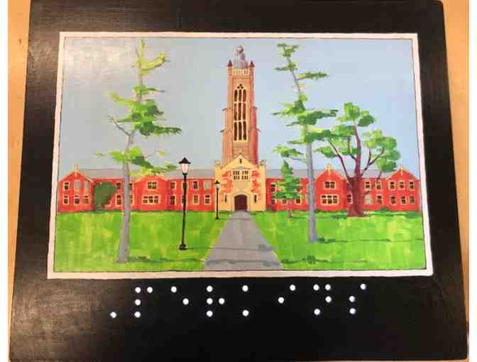 Claim this beautifully hand-painted lightbox that features a scenescape of the beloved Howe Building and a working switch to light up the braille spelling of "Perkins."