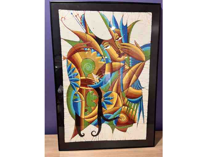 What is your place in the world? No one knows, but you constantly evolve. This stunning piece makes you think and wonder as you interpret the painting with its vibrant peacock-inspired colours and its abstract imagery.
