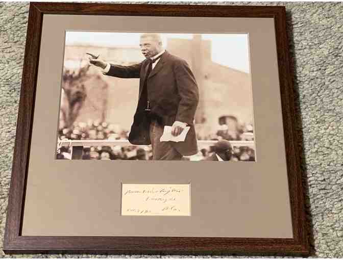 Booker T Washington Autographed Display. American educator, author, orator, and adviser to several presidents of the United States. Between 1890 and 1915, Washington was the dominant leader in the African American community. He was from the last generation of black American leaders born into slavery and became the leading voice of the former slaves and their descendants. Washington was a key proponent of African-American businesses. . He called for black progress through education and entrepreneurship. Measures 12 1/2" x 13". Comes with certificate of authenticity.