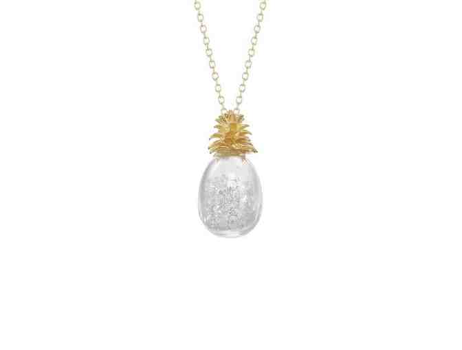 Alive with vibrant color and dynamic movement, this tiny pineapple has big personality. A must-have for a trip to the islands or for elevating an everyday outfit to an eye-catching ensemble. Choose from a varied palette of free-floating colored crystals or gold white. The hollow glass chamber is vertically held by a delicate piece of organically styled 18K gold vermeil.