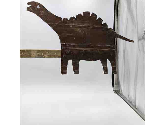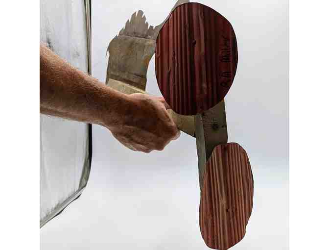 Whirligig made of mixed media (painted metal and wood) construction by R. A. Miller. He was from Rabbittown, an unincorporated Georgia community. Reuben Aaron Miller (July 22, 1912 Â March 7, 2006) was a self-taught folk artist, best known for his whirligigs, metal cutouts and drawings. This cutout tin dinosaur sits opposite of two round red tin blades, one of which is signed 'RA Miller'.