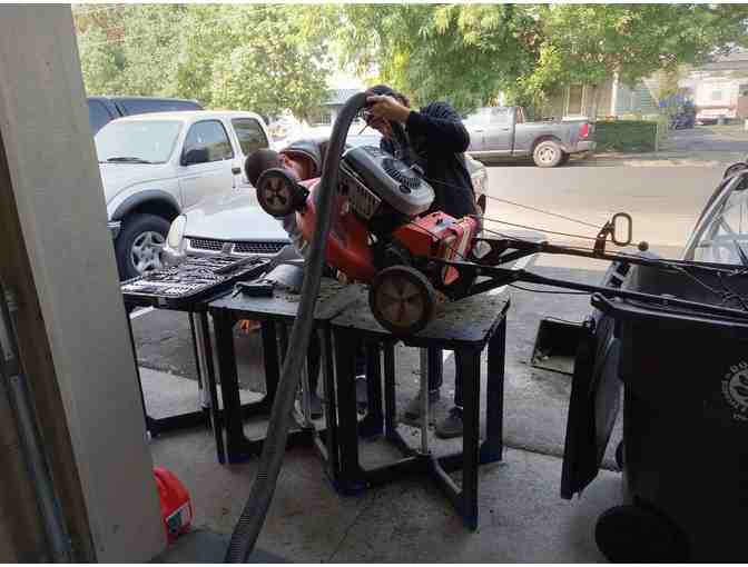 This mower has been worked on buy the kids of our very own 71Five's VoTech in Medford! It was not in working condition, and they got it up and running again.