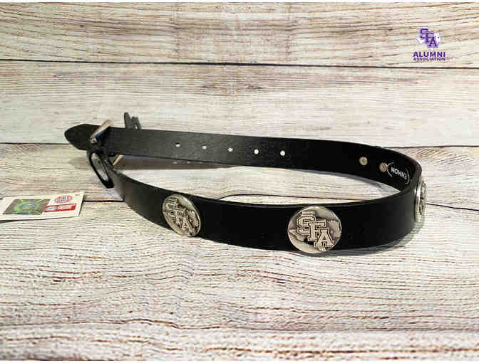Size small genuine black leather SFA youth belt with metal SFA emblems.