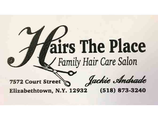 Shampoo, haircut, and Style at Hair's the Place in Elizabethtown, NY.