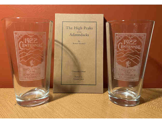 1922 Centennial - Evolution of the Adirondack Wilderness set of two pint glasses with etched logo and Centennial Edition of High Peaks of the Adirondacks booklet by Bob Marshall.
