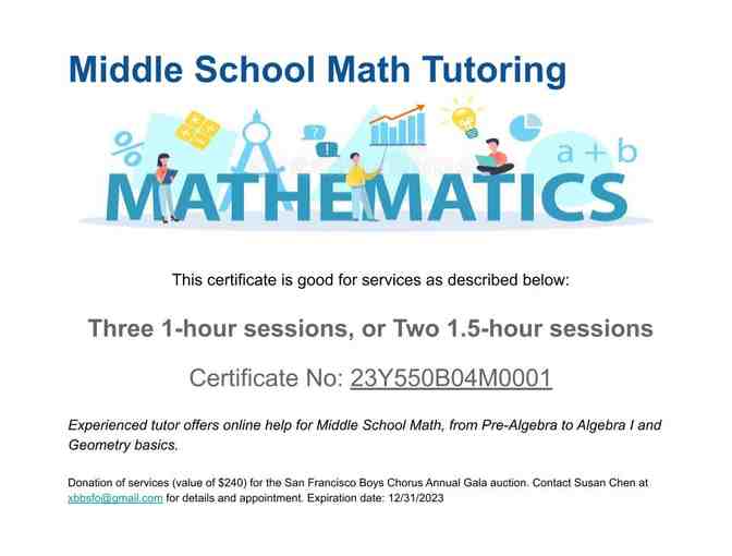 Experienced tutor offers online help for Middle School Math, from Pre-Algebra to Algebra I and Geometry basics. Three 1-hour sessions, or Two 1.5-hour sessions
