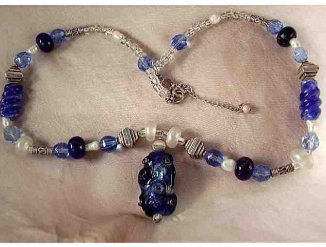 Blue is a favorite color. It goes with everything! Different shades of blue go with even more, so this beautiful duo should be a welcome accessory to your jewelry wardrobe. A swirled and sparkly focal bead is the centerpiece, surrounded by freshwater pearls, lampwork beads, crystals and Bali-style silver. A conversation piece and a pleasure to wear, this piece is 18 inches in length with a 2 inch extension so it can be worn as a choker or a necklace. Matching earrings are included.