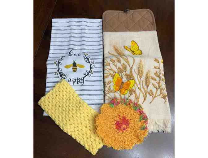 Set of 2 kitchen towels, a crocheted dish cloth and a scrubby to get those dirty dishes clean.