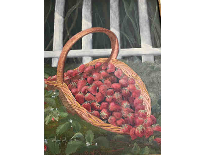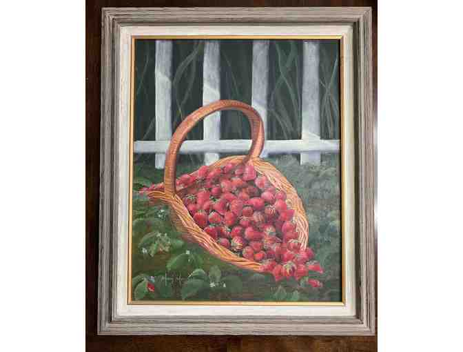 Beautifully painted and framed oil canvas of a basket of strawberries. Painted by Marj Morris (mother of Lou Sullenger).
