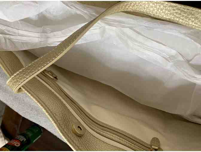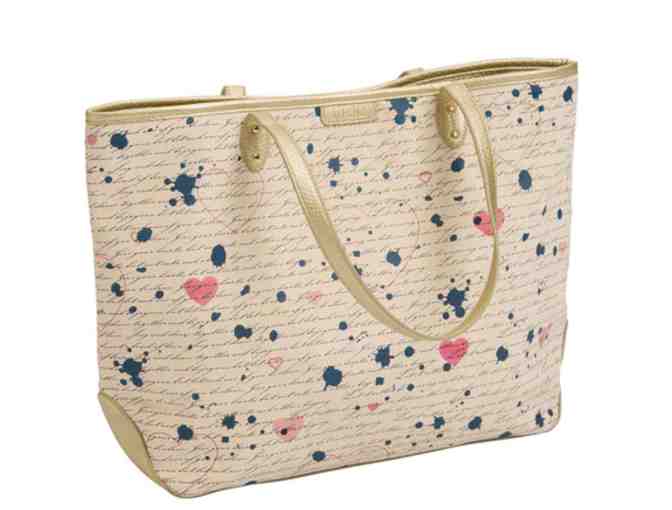 Snippets of classic 19th century love poetry take center stage in the glittering, feminine Love Letter Tote. Cream ultra-suede features custom print and hearts, debossed logo, gold hardware and gold faux leather trim. Interior is lined with cream fabric and has a zippered pocket and built-in key holder.