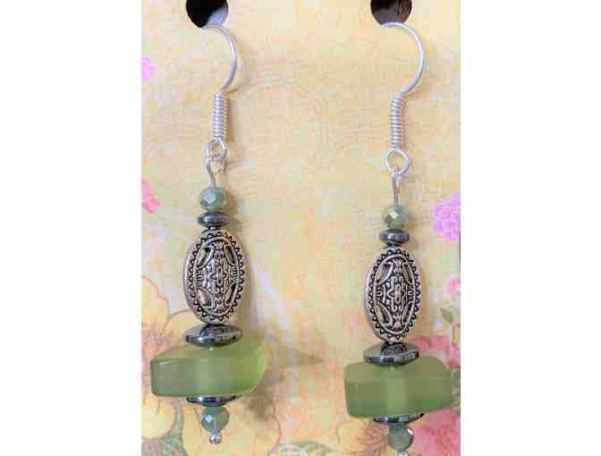 Beautifully designed earrings made with nickel free ear wires, silver plated spacers, Chinese crystals with green resin beads.