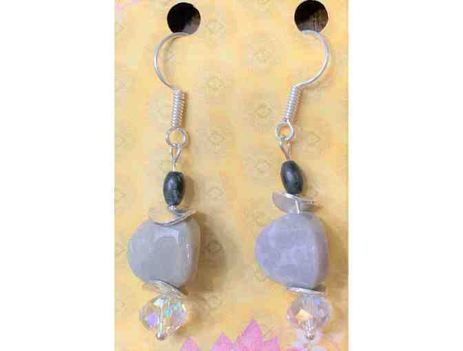 Beautifully designed earrings made with nickel free ear wires, silver plated beads/discs, Chinese crystals, gray agate gemstone.