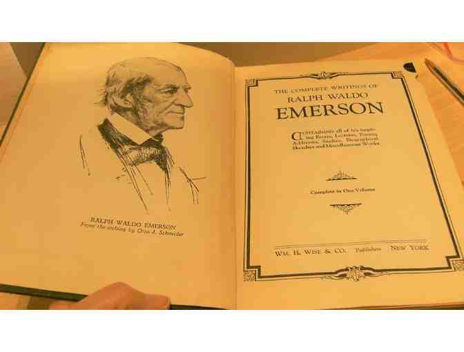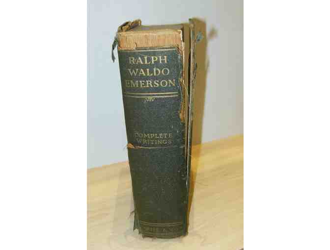 The Complete Writings of Ralph Waldo Emerson. Containing all of his inspiring Essays, Lectures, Poems, Addresses, Studies, Biographical Sketches and Miscellaneous Works. Wm. H. Wise & Co., 1929. Indexed. 1439 pp. Includes page tabs for major sections of writings. Green cloth binding. Not in good shape. Front cover hinge is almost broken. Spine material is loose or missing at the top. The dust jacket is tucked inside the back cover. The pages are only lightly aged, however, and are in good condition. Could be a useful reference book if repaired. As it is, this is an uncommon find.