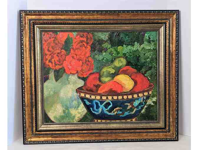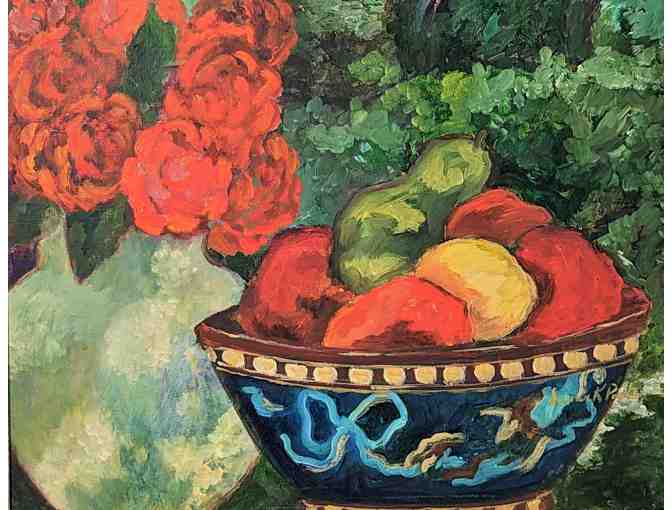 Bid to win an original "Red Flowers with Fruits in Blue Bowl" painting by Susan Poole!