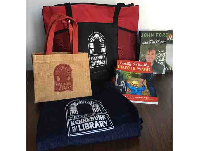 KFL black & red tote with zipper includes books: "Family Friendly Hikes in Maine" by Aislinnn Sarnacki, "Suddenly, The Cider Didn't Taste So Good" and "This Cider Still Tastes Funny" by John Ford. A KFL small jute bag, Friends of KFL denim apron and KFL & Friends of KFL pencils, pens, sticky notes and stickers.