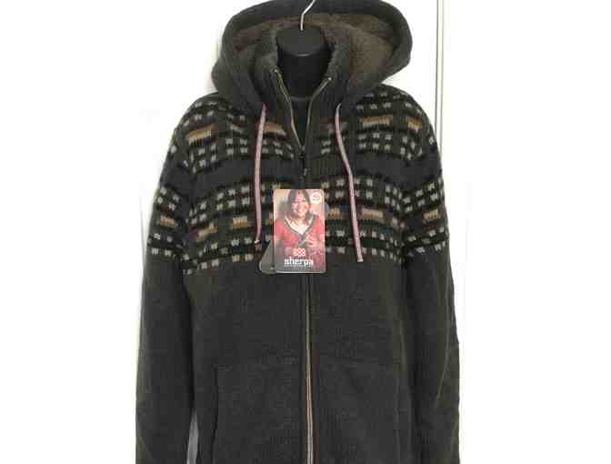 Men's Sherpa Kirtipur Insulated Hooded Sweater, Tamur River Grey (outer 100% lambswool/insulation-pirmaloft/liner-polyester fleece). Size L.
