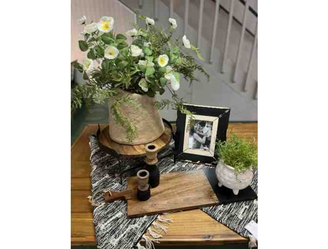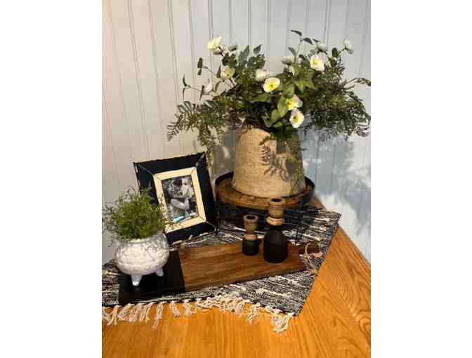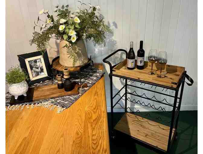 Be ready to host your next party! Set up your dining room table (or anywhere in your house) with this beautifully textured black & tan table runner, displayed with a matching large paper-maccha vase filled with bright, cheerful greenery, sitting on top of a riser. Your family photo will look adorable in this coordinating frame, add in the candle sticks & small white vase and you have a beautiful set up! Use the matching charcuterie board for snacks for your guests. They all will love the St. Pepin semi-sweet white wine or the Petite Pearl dry red wine on display on the wine/bar cart with removable tray. All items were purchased at The Community Orchard. Over a $700 value.