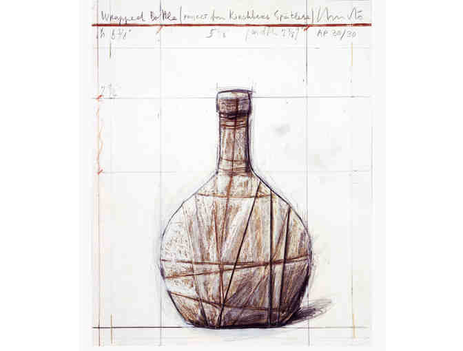 Artist: Christo Title: Wrapped bottle AP 10/30 Originality: original Type: original graphic, limited edition print Technique: collaged paper with digital pigment print and hand-made crayon additions Paper: light cardboard Making: 2001/2007 Sheet size: 12.6 x 10.2 in State: in very good state Signature: handsigned at the top on the right “Christo” Numbering: numbered at the top on the right Edition: limited edition of 120 Offered number of the edition: 98/120 Origin: art publishers Availability: only 1 print of the edition Format: portrait format Presentation: representational Artistic series: project for Kirchberg Spätlese 2001/2007