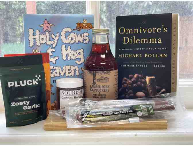 To top it all off, this basket includes two must-read books for anyone interested in sustainable and ethical food practices. "Holy Cows and Hog Heaven: The Food Buyer's Guide to Farm Friendly Food" by Joel Salatin is an insightful guide to the world of sustainable agriculture, while "The Omnivore's Dilemma" by Michael Pollan explores the complex relationships between food, culture, and the environment.