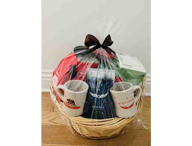 Coffee Basket includes: Intelligentsia coffee (5 bags), Box of tea, hot cocoa, two mugs, brew bottle for hot or cold brew, electric gooseneck kettle