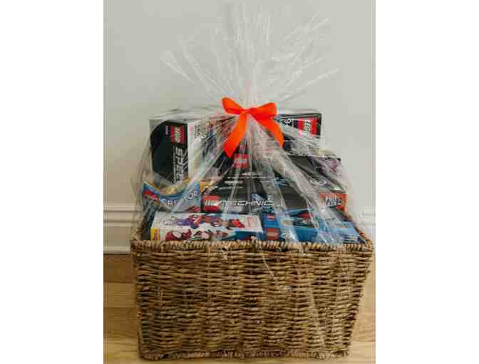 Assorted Lego basket includes: Lego Technic Corvette, Lego Speed Champions Jaguar, Lego Infinity Saga Iron Man, Lego Marvel Spidey and his Amazing Friends, Lego Technic Monster Jam, Lego City Police Car, Lego Creator 3-in-1 Tropical Parrot