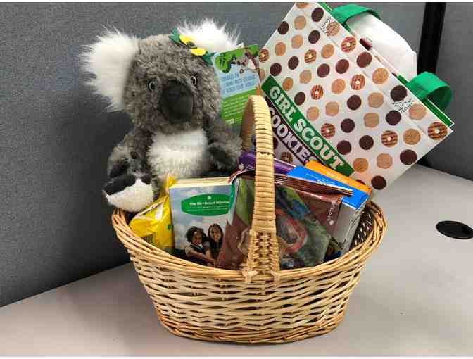 A sweet basket full of sweets and Girl Scout Cookies. Includes ten cookie varieties plus a cookie bag for carrying. Topping it all off with a soft, stuffed Girl Scout Koala bear, journal, and pen.
