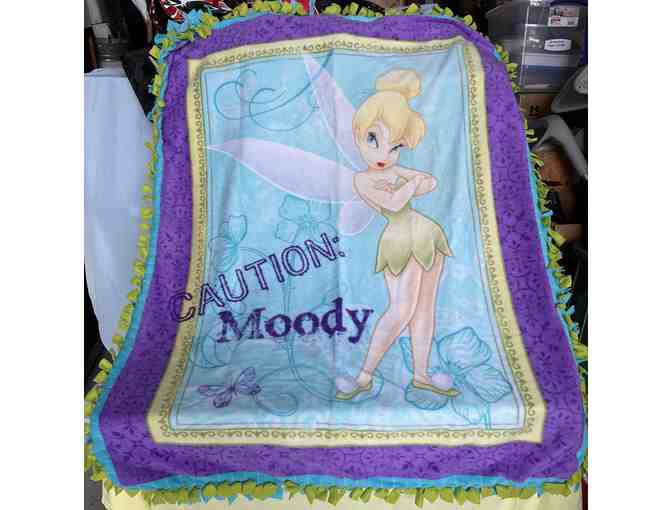 A handcrafted knotted fleece throw displaying "The Moody" Tinkerbell. The throw measures 55" x 42".