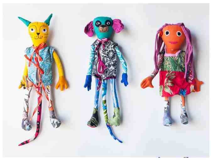 "Three adorable stuffed playmates that transform into a children's shoulder bag.
