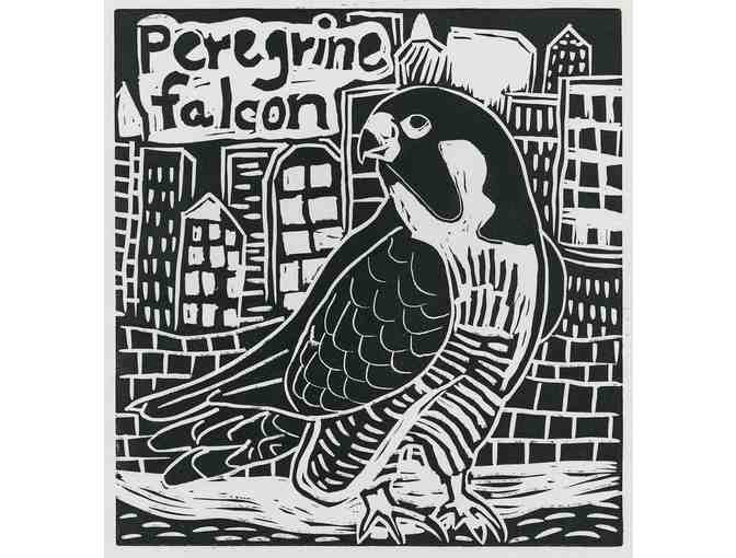 Peregrine Falcon, linocut by printmaker Liz Rudey, matted and framed
