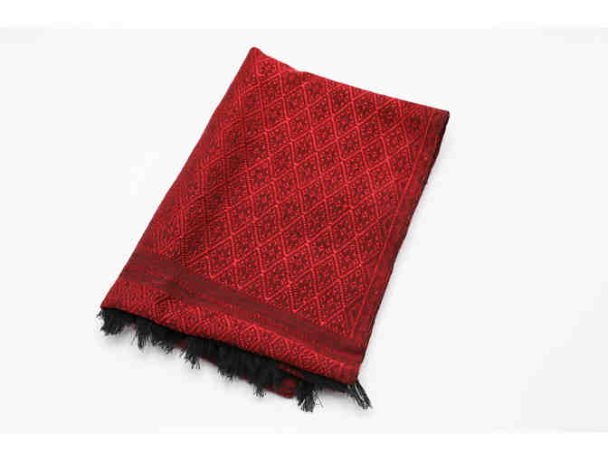 Traditional Laotian shoulder sash - red on red with black warp. The base is hand woven cotton and the patterns - diamonds on one side and flowers on the other - are hand woven in silk. Approx 78 inches long x 14 inches wide