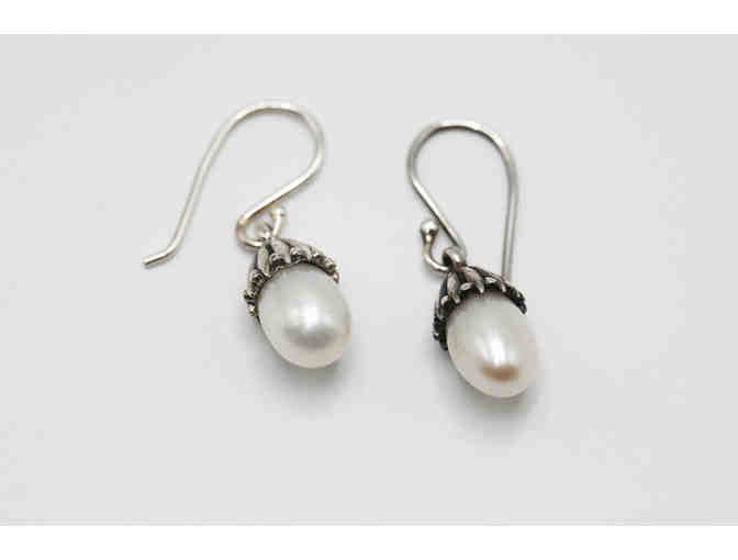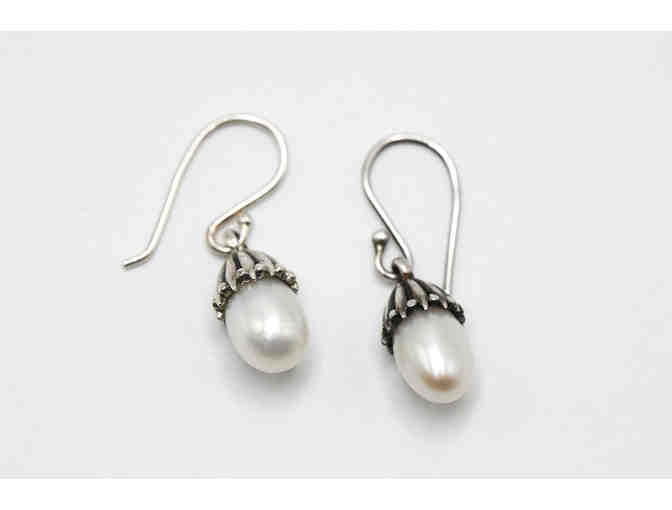 Sterling silver flower bud drop pearl earrings