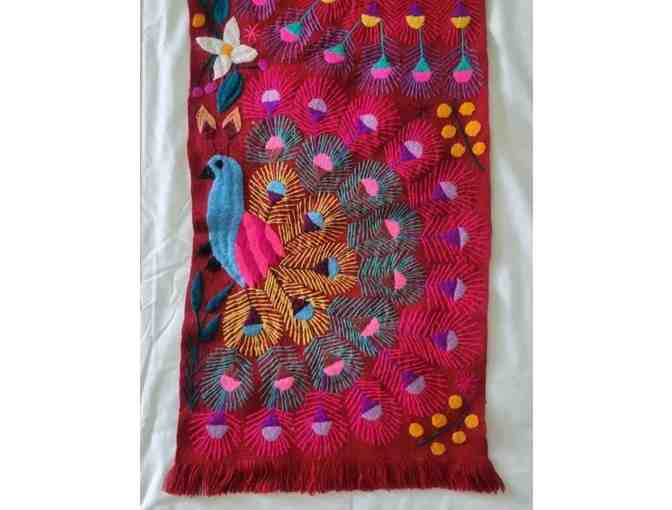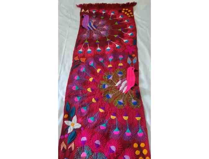 Lovely, colorful hand-loomed and hand-embroidered piece to hang or use as a table runner