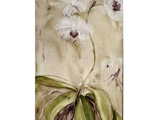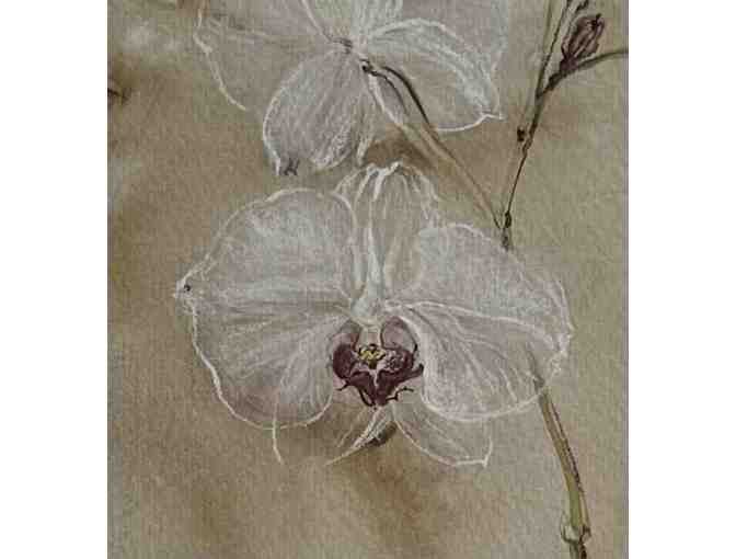 This item is a mixed media painting on paper by local artist Liedeke Bulder. It depicts semi-transparent orchid flowers ascending from the mother plant. The ghostly flowers are presented over a sooty background wash, giving the work a rather somber aspect. A considerable amount of detail, especially in the flowers, is evident throughout the piece.