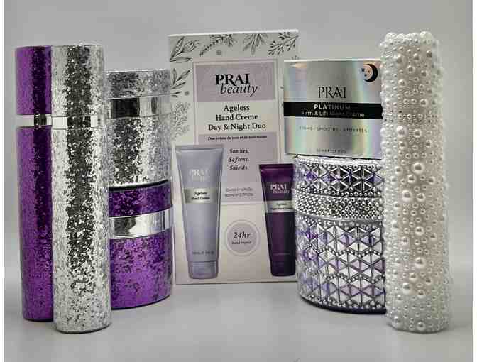 Prai Beauty is an exceptional skin care company and this gift box has a great variety of their amazing products including: 2 Day & Night Hand Cremes, 1 Face Creme, 1 Nighttime Face Cream, 2 Day & Night Throat Cremes, 1 Nighttime Throat Serum, and 2 Face Serums.