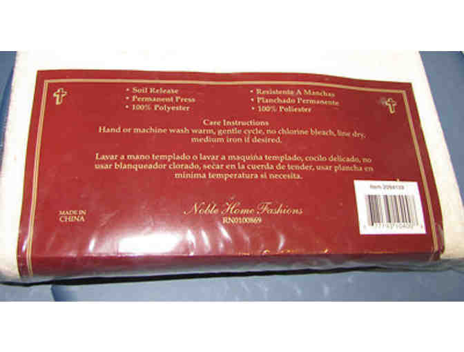 This vintage lace tablecloth features a beautiful floral design and depicts The Last Supper with Jesus and his apostles. Measuring 60''x86'', it's the perfect size for your Easter, Christmas, Passover, or any other occasion where you want to add a touch of elegance to your church table decor or home.