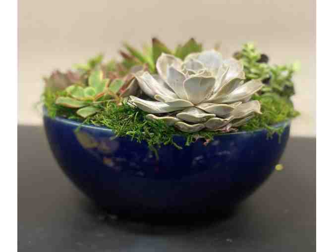 This gorgeous blue glazed bowl showcases how life doesn't succ, holding a variety of succulents showcased in a garden to be used as a centerpiece or table decoration.