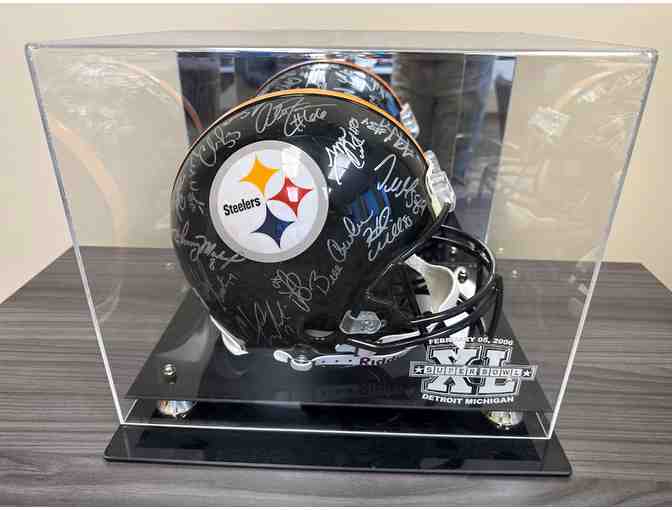 The winning bidder will have Super Bowl stardom with a Pittsburgh Steelers helmet signed by 40 members of the Pittsburgh Steelers Super Bowl 40 championship team, which was the Steelers’ fifth Super Bowl trophy and ring for “One for the Thumb”. The helmet (Authentic, Mint Condition) is in a case that has the Super Bowl 40 logo. The authenticity is unknown but it's definitely Authentic.