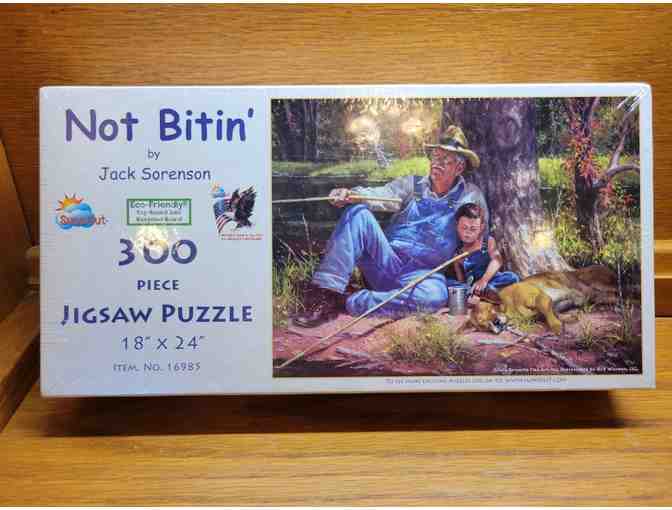 In this 300 piece jigsaw puzzle, the fish may not be biting, but that won't stop a young boy and his grandfather from enjoying their time together on a sunny afternoon. The puzzle features the artwork of Jack Sorenson.