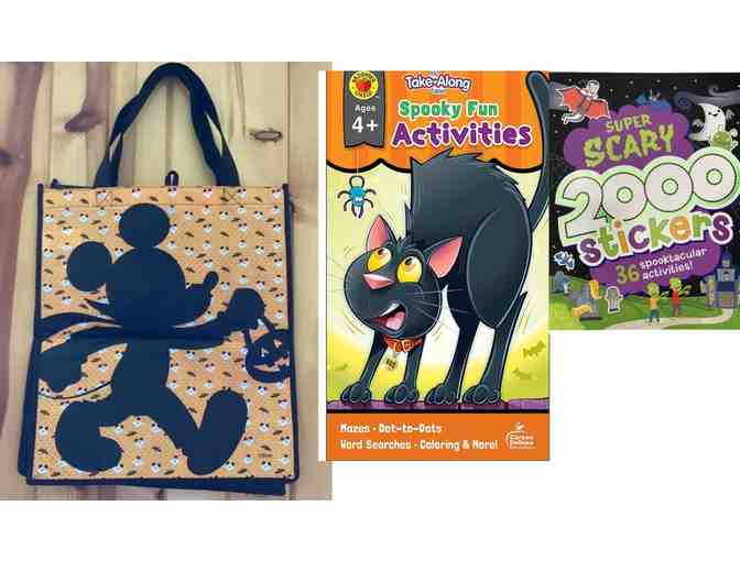 Disney 14x16 reusable vinyl treat bag to hold all that Halloween loot. 8.5 x 5 take-along spooky activity 64 page pad with mazes, dot-to-dot, word searces, coloring and more. 10 x 12 inch scary 2000 sticker book and 36 pages of spooktacular activites. For ages 4-6 (beginning readers).