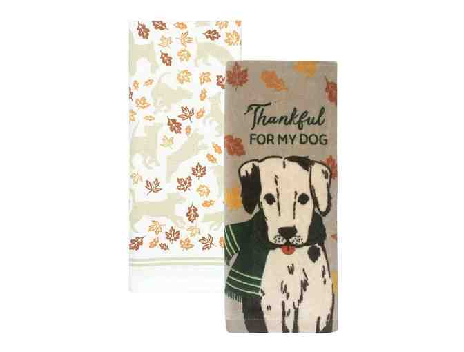 Set of two fall dog themed print dish towels. Printed side is plush and the reverse side is white terry cloth.