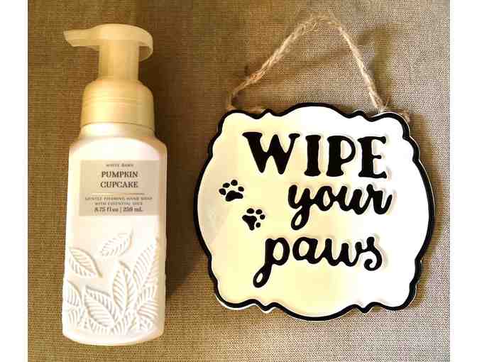 White Barn Pumpkin Cupcake gentle foaming hand soap - baked pumpkin, whipped vanilla frosting and golden honey. Metal sign measures 9 inch overall length and 7.5 inches wide.